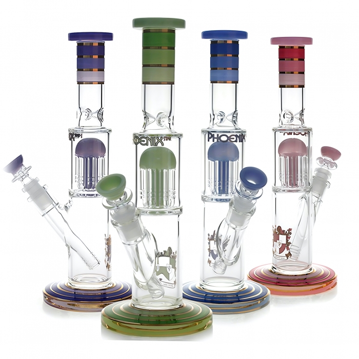 Model No. PHX570BUThis 30cm Phoenix Star Percolator Bong with 8 Arms Perc is the perfect mix of style and strength. Made from thick 5mm glass, it features a fancy 24K gold line design and a solid round base. The glass smoking pipe is equipped with 8 arms tree percolator for better filtration and diffusion to offer a cooler and smoother hit. It’s built to last and looks great on any table.